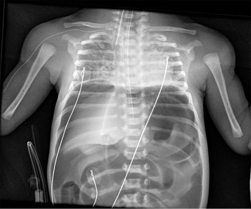 Varón de 32 semanas de gestación, segundo gemelar, de 1850 g, nacido mediante cesárea urgente por amniorrexis prolongada, muerte del primer gemelo, leucocitosis y fiebre materna. Apgar 6/8. Precisa CPAP nasal las primeras horas de vida con buena evolución.