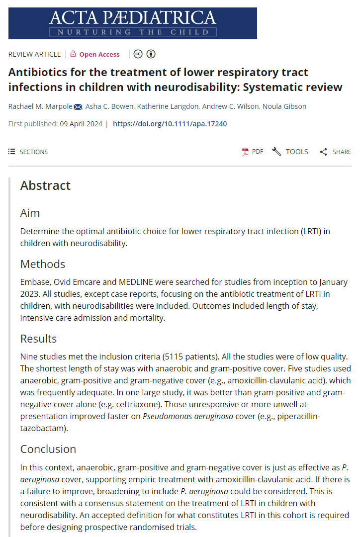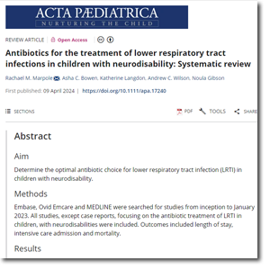 Marpole RM, Bowen AC, Langdon K, Wilson AC, Gibson N. Antibiotics for the treatment of lower respiratory tract infections in children with neurodisability: Systematic review. Acta Paediatr. 2024;113(6):1203-8.