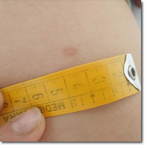 Paciente de 13 años, sin antecedentes de interés, que consulta por lesión pruriginosa en la piel de un mes de evolución. Presenta en la zona lumbar una lesión maculopapular ovalada de aproximadamente 1 cm de diámetro y coloración rosada. Tras la manipulación se observa enrojecimiento y aumento de tamaño de la lesión.