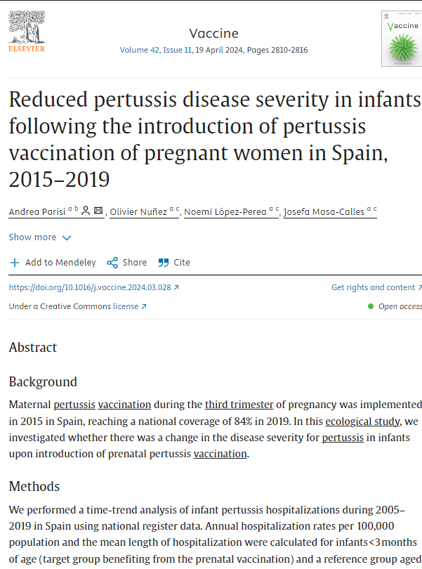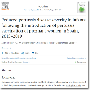 Parisi A, Nuñez O, López-Perea N, Masa-Calles J. Reduced pertussis disease severity in infants following the introduction of pertussis vaccination of pregnant women in Spain, 2015-2019. Vaccine. 2024;42(11):2810-6.