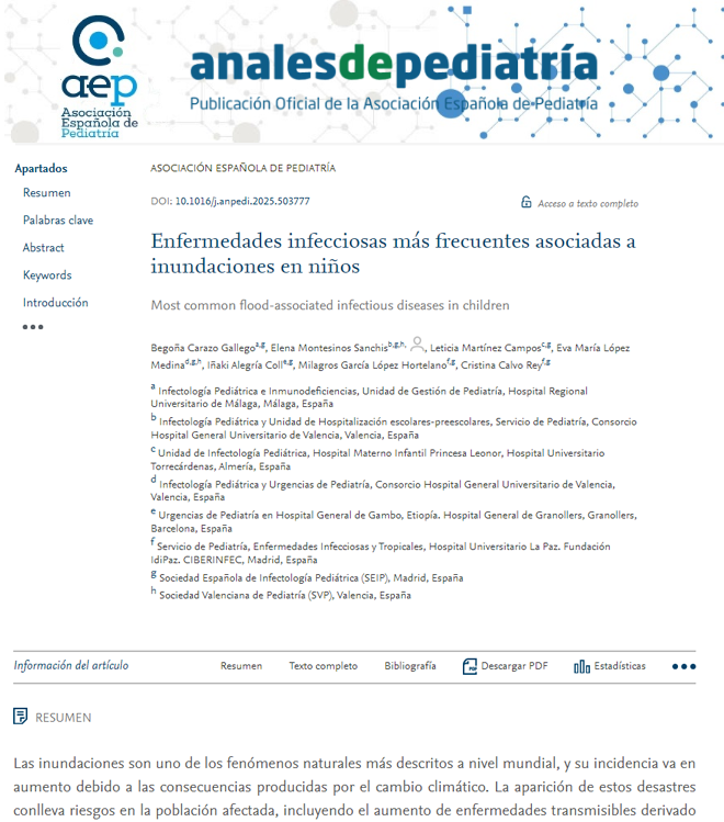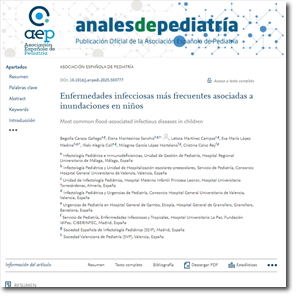 Carazo Gallego B, Montesinos Sanchis E, Martínez Campos L, López Medina EM, Alegría Coll I , García López Hortelano M, et al. Enfermedades infecciosas más frecuentes asociadas a inundaciones en niños. An Pediatr (Barc). 2025;102:503777.