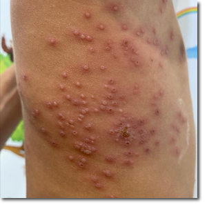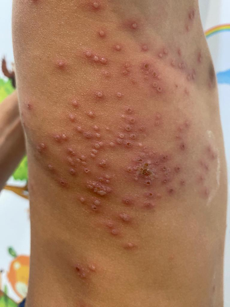 Niño de cuatro años, con antecedentes de dermatitis atópica, que consulta por múltiples lesiones papulosas, niega prurito, aunque el paciente las tocaba con frecuencia, redondeadas, de superficie lisa con base eritematosa, localizadas en la parrilla costal derecha y alguna aislada en la zona anterior del tórax. No presenta lesiones vesiculoampollosas ni purpúricas.