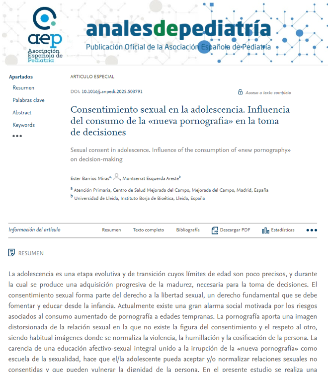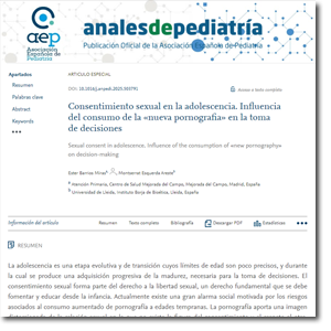 Barrios Miras E, Esquerda Areste M. Consentimiento sexual en la adolescencia. Influencia del consumo de la “nueva pornografía” en la toma de decisiones. An Pediatr (Barc). 2025;102: 503791.