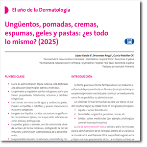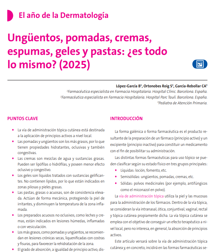 López García B, Ortonobes Roig S, García Rebollar C. Ungüentos, pomadas, cremas, espumas, geles y pastas: ¿es todo lo mismo? (2025). Form Act Pediatr Aten Prim. 2025;18(1):52-7.