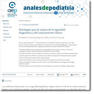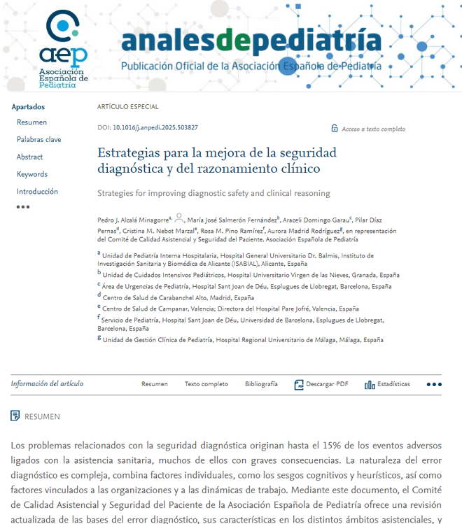 Alcalá Minagorre PJ, Salmerón Fernández MJ, Domingo Garau A, Díaz Pernas P, Nebot Marzal CM, Pino Ramírez RM, Madrid Rodríguez A; en representación del Comité de Calidad Asistencial y Seguridad del Paciente. Asociación Española de Pediatría. Estrategias para la mejora de la seguridad diagnóstica y del razonamiento clínico. An Pediatr. 2025;102(4):503827.