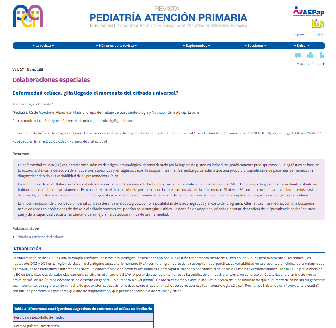 Rodríguez Delgado J. Enfermedad celíaca. ¿Ha llegado el momento del cribado universal? Rev Pediatr Aten Primaria. 2025;27:203-10.