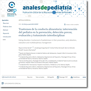 Jiménez García R, Canga Espina C, Múñoz Domenjó A, Ochando Perales G, Díez Suárez A. Trastornos de la conducta alimentaria: intervención del pediatra en la prevención, detección precoz, evaluación y tratamiento interdisciplinar. En Artículos destacados. Continuum 2026. [en línea] [consultado el 27.01.2026]. Disponible en http://continuum.aeped.es