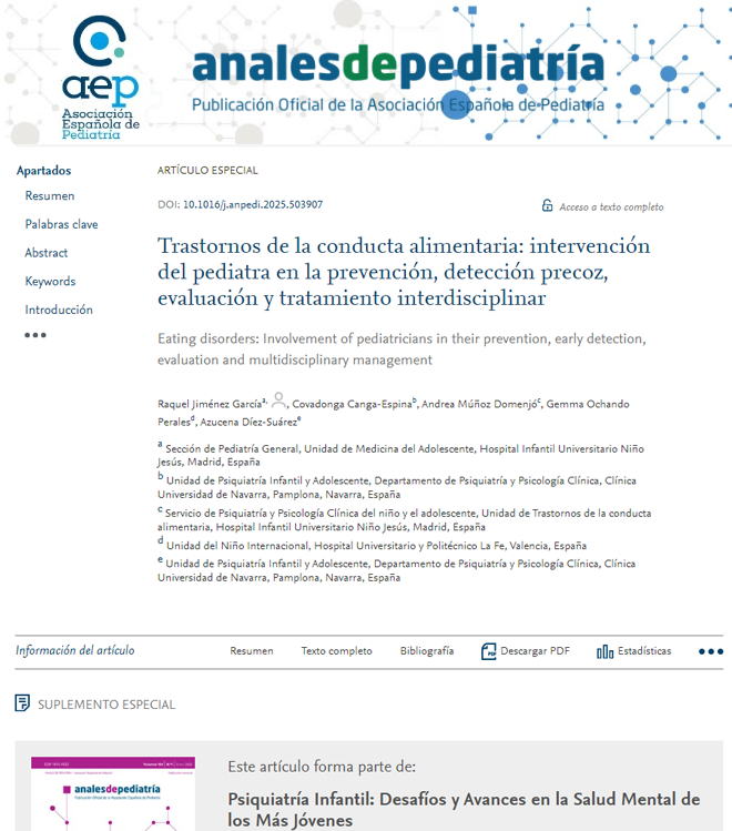 Jiménez García R, Canga Espina C, Muñoz Domenjó A, Ochando Perales G, Díez Suárez A. Trastornos de la conducta alimentaria: intervención del pediatra en la prevención, detección precoz, evaluación y tratamiento interdisciplinar. An Pediatr (Barc). 2025;103:503907.