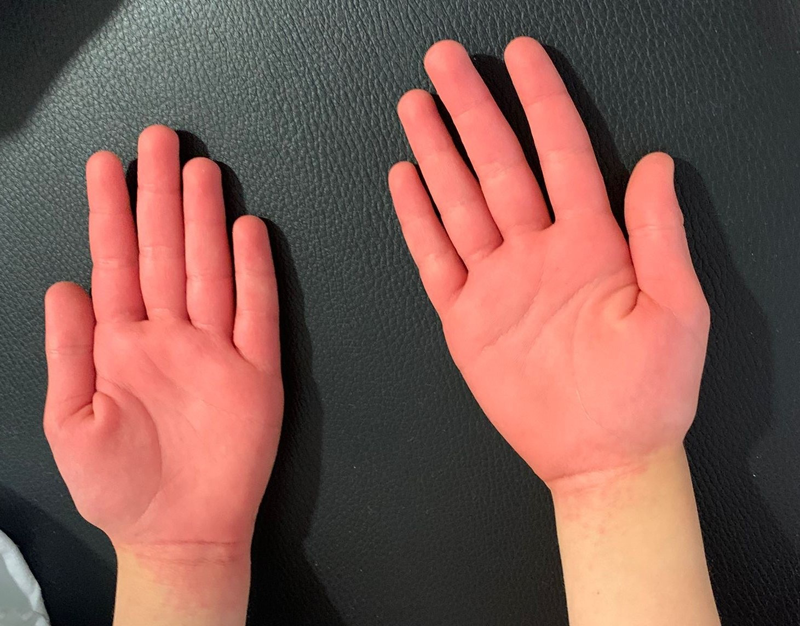 Niño de 6 años que acude a Urgencias por enrojecimiento en las palmas de las manos. Además, asocia fiebre de 2 días de evolución (máximo 38,5 °C) y odinofagia.