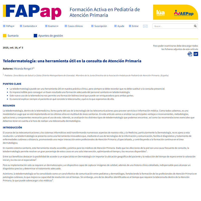 Miranda Rengel F. Teledermatología: una herramienta útil en la consulta de Atención Primaria. Form Act Pediatr Aten Prim. 2025;18;146-50.