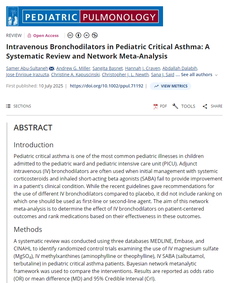 Abu-Sultaneh S, Miller AG, Basnet S, Craven HJ, Dalabih A, Irazuzta JE, et al. Intravenous Bronchodilators in Pediatric Critical Asthma: A Systematic Review and Network Meta-Analysis. Pediatr Pulmonol. 2025;60(7):e71192.