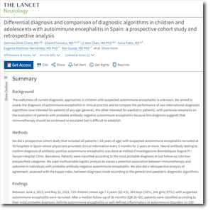 Olivé-Cirera G, Fonseca E, Chen LW, Fetta A, Martínez-Hernández E, Guasp M, et al. Differential diagnosis and comparison of diagnostic algorithms in children and adolescents with autoimmune encephalitis in Spain: a prospective cohort study and retrospective analysis. Lancet Neurol. 2025;24(1):54-64.