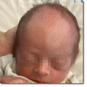 Recién nacido pretérmino de bajo peso para la edad gestacional (34 + 5 semanas, 1500 g). Gestación controlada con estudios prenatales normales. En la exploración física inicial, se objetiva mechón blanco en la línea frontal medial y mácula hipocrómica en la frente, sin otras alteraciones.