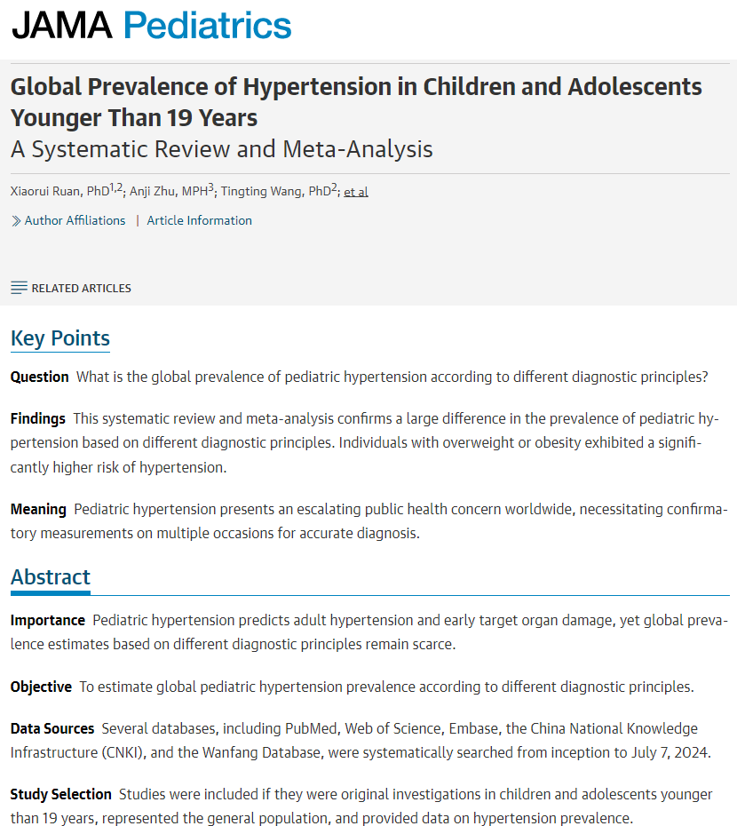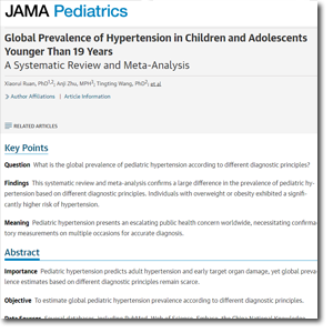 Ruan X, Zhu A, Wang T, Sun M, Chen K, Luo M, et al. Global Prevalence of Hypertension in Children and Adolescents Younger Than 19 Years: A Systematic Review and Meta-Analysis. JAMA Pediatr. 2025;179(9):987-99.