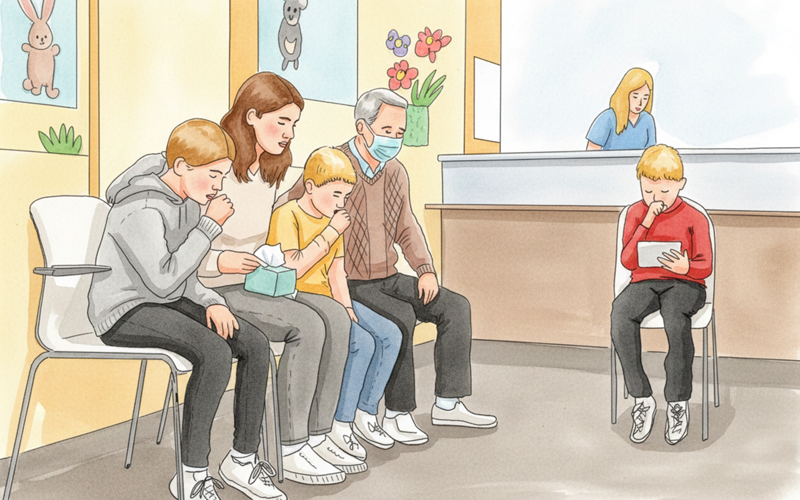 Nueve pacientes de entre 8 y 12 años acuden a la consulta en apenas dos semanas refiriendo "toses espantosas", astenia y fiebre. Presentan una exploración con auscultación patológica y afectación del estado general, lo que obliga a plantear un diagnóstico diferencial ante un posible brote de infección por patógenos atípicos.