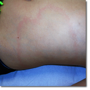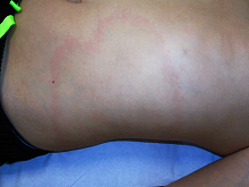 Niño de 11 años, previamente sano, que acude por una lesión anular en el abdomen de aproximadamente un mes de evolución. La lesión apareció mientras el paciente se encontraba en un entorno rural y fue creciendo centrífugamente sin asociar prurito ni dolor. No recuerda si presentó una picadura en esa zona. Por lo demás, asintomático en todo momento.