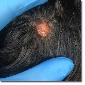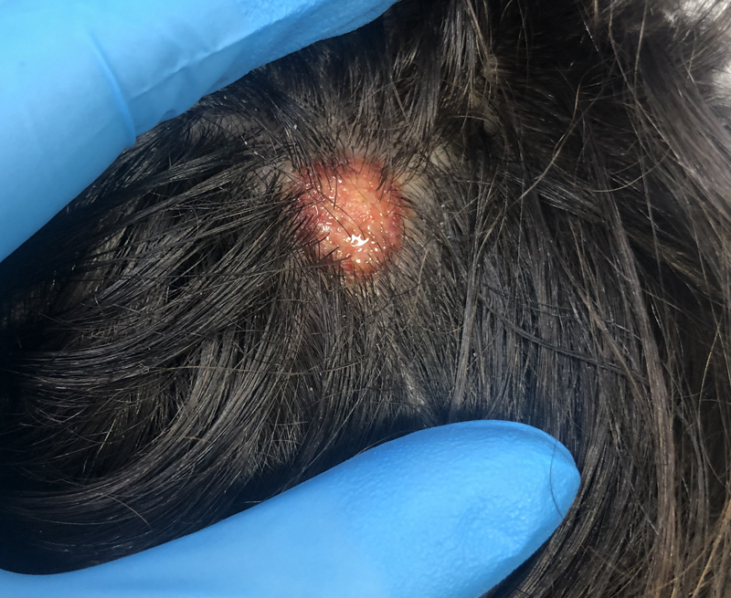 Varón de 5 años que consulta por una lesión en el cuero cabelludo de 10-15 días de evolución, iniciada como una pápula pruriginosa de crecimiento progresivo. El paciente se encuentra afebril, sin otros síntomas ni familiares afectos. No refiere contacto con animales, salvo con un perro en el domicilio de sus abuelos. Ha recibido tratamiento tópico con ozenoxacino durante 3 días, sin mejoría.