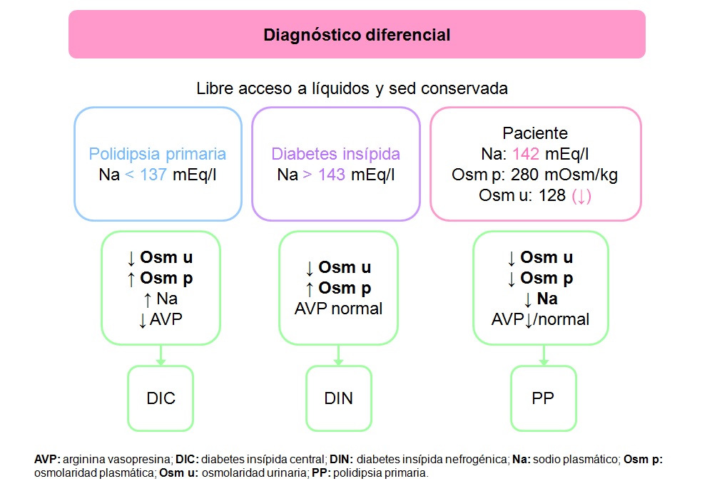 En la analítica encontramos un sodio plasmático de 142 mEq/l, osmolaridad urinaria de 128 mOsm/kg y osmolaridad plasmática de 280 mOsm/kg. ¿Cuál es el diagnóstico de la paciente?