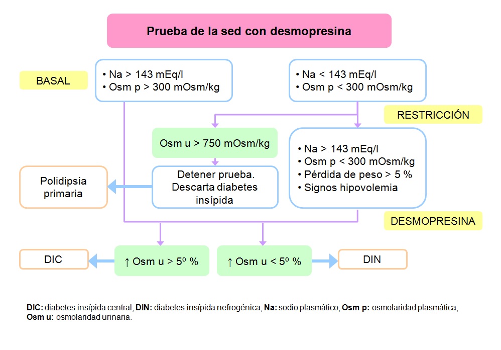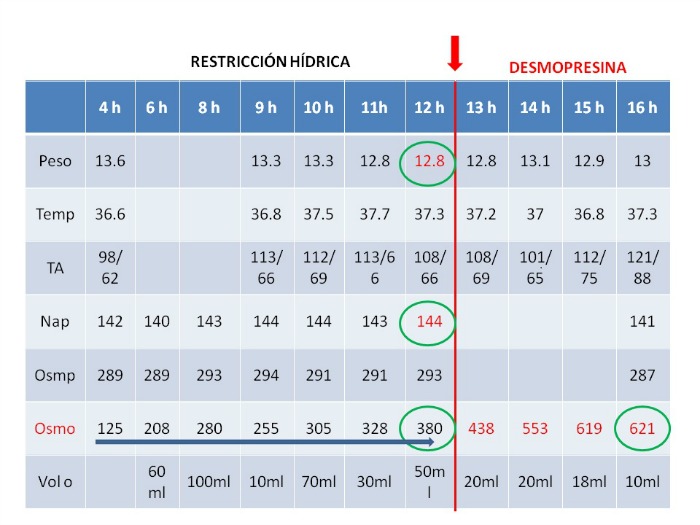 Dado que los datos obtenidos en la analítica no son concluyentes, para realizar el diagnóstico diferencial se decide realizar la prueba de la sed. Durante la prueba se realiza una monitorización horaria de temperatura, peso, presión arterial, sodio plasmático, osmolaridad plasmática, osmolaridad urinaria y volumen urinario. Tras ocho horas de restricción hídrica, la prueba se suspende por la pérdida de más de un 5% de peso y una natremia > 143 mEq/L. Se administra desmopresina con los siguientes resultados.