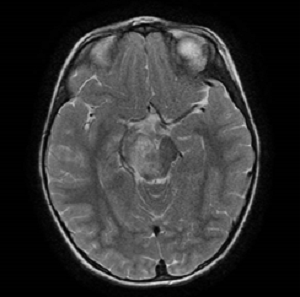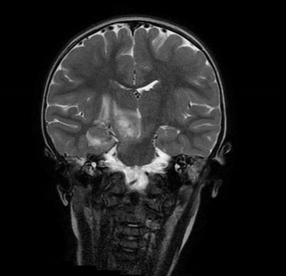 Se realiza resonancia magnética (RM) cerebral, que evidencia lesión mal definida de unos 3,1 × 3,6 cm, heterogénea, hiperintensa en T2 y flair con algunas calcificaciones puntiformes, centrada en pedúnculo cerebral derecho con carácter expansivo. Extensión caudal hacia protuberancia y paramedial izquierda hacia pedúnculo cerebeloso superior derecho. Se extiende también al tálamo derecho. alcanzando el brazo posterior de la cápsula interna, hipocampo y uncus derecho, con afectación corticosubcortical. Presenta mínimo edema perilesional, provocando engrosamiento parcial en la región derecha del quiasma óptico. Produce discreto efecto de masa con parcial obliteración ventricular.