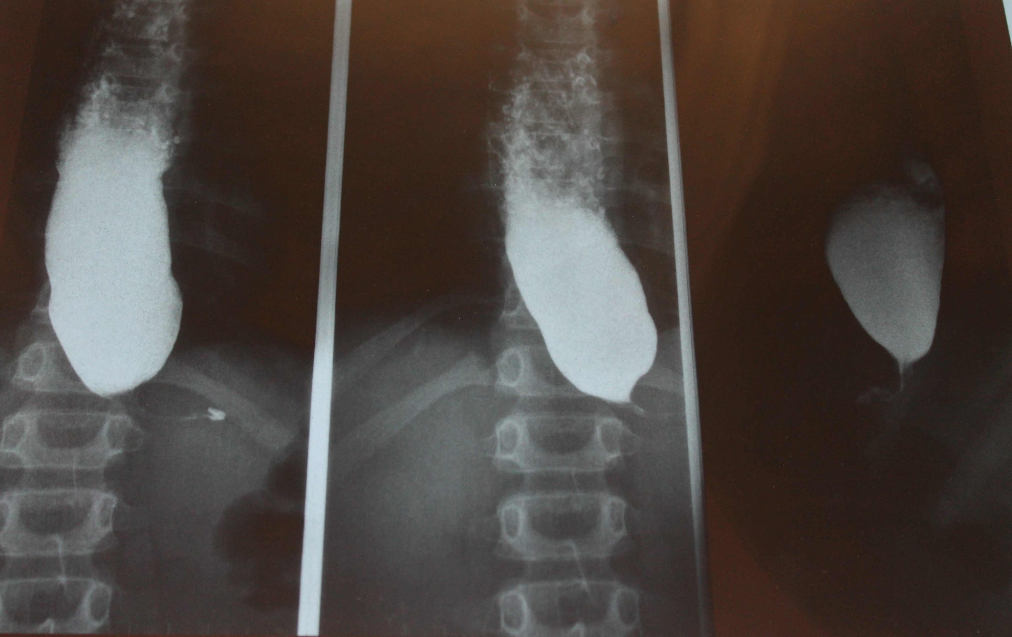 Se realizó una endoscopia en la que se observó una importante retención alimentaria con esofagitis e hipertrofia del cardias (muy cerrado) y dos úlceras de pequeño tamaño en el tercio distal del esófago y el fundus, con gastritis de grado III, de las cuales se obtuvieron biopsias.