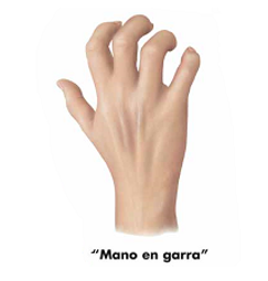 Auscultación cardiopulmonar normal, abdomen normal, otorrinolaringología normal. Mano en garra, marcha alterada.