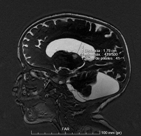 • RM cerebral compatible con malformación de Dandy-Walker sin cambios respecto a la previa.