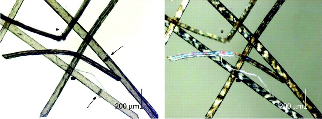Al microscopio óptico se observa muestra de pelo terminal con imágenes de tricosquisis (fractura limpia transversal del tallo piloso), pilitorti (el pelo se retuerce sobre su eje longitudinal, presentando engrosamientos intercalados, adoptando un aspecto en trenza), y el signo de la cola de tigre (bandas oscuras y claras alternadas observadas bajo el microscopio de luz polarizada).