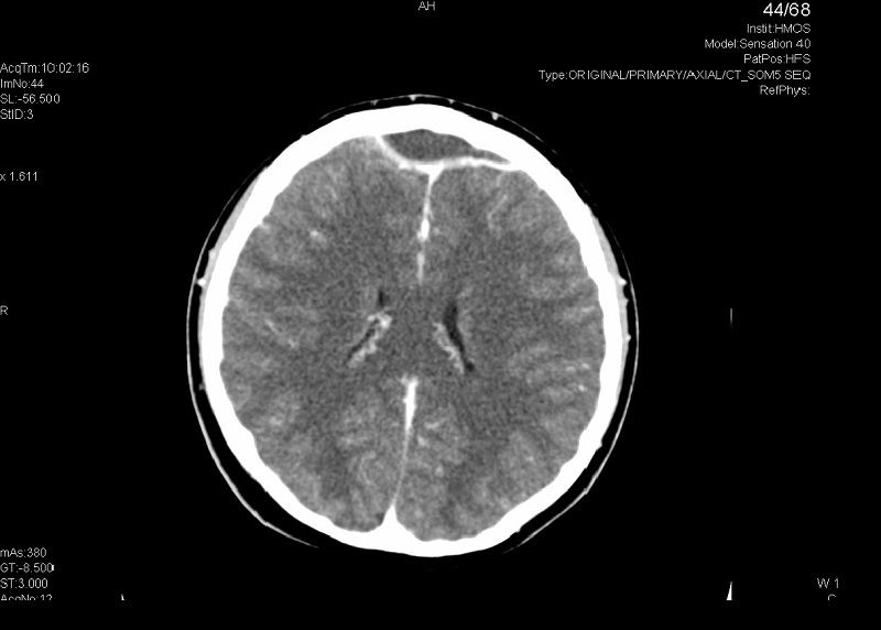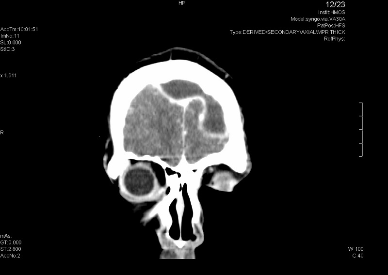 Ante los hallazgos del fondo de ojo se decide realizar una tomografía computarizada (TC) craneal, que es compatible con sinusitis en senos paranasales izquierdos frontal, maxilar y celdillas etmoidales anteriores-medias complicada con absceso epidural anterior bifrontal (de 6 × 2 cm) y solución de continuidad/dehiscencia milimétrica en pared posterior de seno frontal izquierdo.