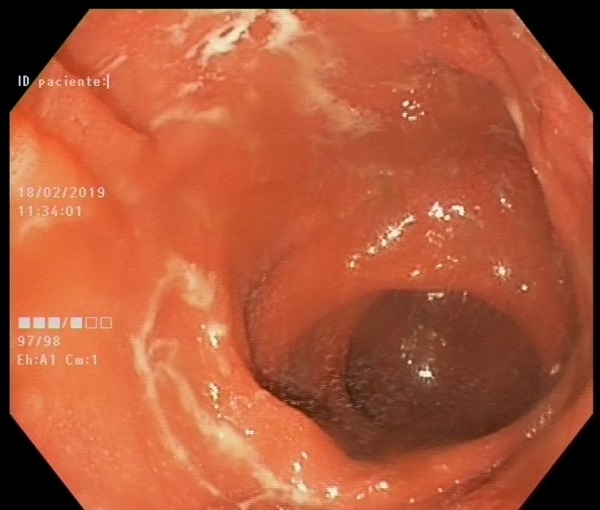 Tras la valoración clínica inicial y ante estudios analíticos sugestivos de inflamación intestinal se decide realizar una colonoscopia total e ileoscopia con toma de biopsias. El diagnóstico es claro: rectosigmoiditis ulcerosa y afectación de colon derecho. Ante debut de colitis ulcerosa se inicia tratamiento de mantenimiento con mesalazina vía rectal y oral1.