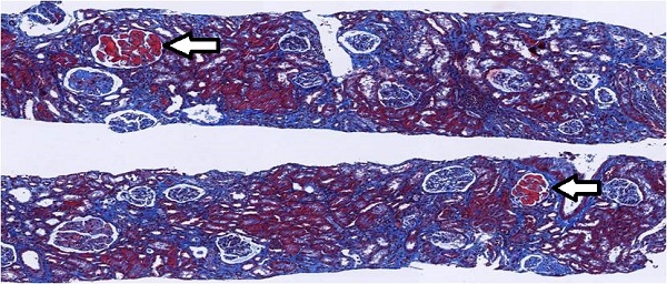 La biopsia renal confirma el diagnóstico de MAT aguda/subaguda con signos de actividad importantes.