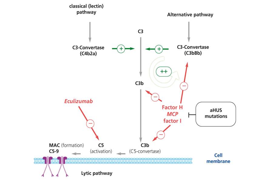 El eculizumab es un anticuerpo monoclonal IgG humanizado recombinante que inhibe la activación del complemento terminal impidiendo la generación del complejo C5b-C9 (complejo de ataque a membrana [CAM]) del complemento terminal.