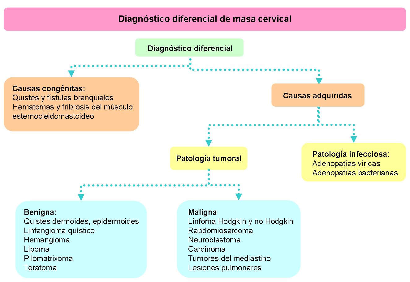 Las causas tumorales a considerar incluyen tumores benignos como quistes dermoides, epidermoides, linfangioma quístico, hemangioma, lipoma, pilomatrixoma y teratoma, y tumores malignos como linfoma, carcinomas, rabdomiosarcoma, neuroblastoma, adenopatías de tumores del mediastino y lesiones pulmonares.