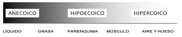 En la figura 1 se muestra la escala de color. Las imágenes que se forman en ecografía se obtienen en una escala de grises, desde el negro (estructuras anecoicas) al blanco (estructuras hiperecoicas).