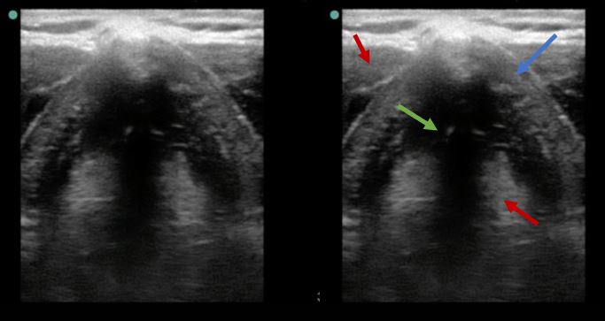 En la figura 2 se aprecia el corte transversal del cuello a la altura del cartílago tiroides. Puede identificarse el cartílago tiroides como una estructura hipoecogénica en forma de herradura (flecha azul). También vemos estructuras musculares hipoecoicas heterogéneas (flechas rojas) y una estructura ligamentosa hiperecogénica fina (flecha verde), correspondientes a los ligamentos de las cuerdas vocales (glotis abierta).