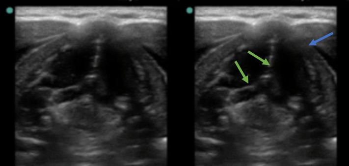 En la figura 3 se aprecia el corte transversal del cuello a la altura del cartílago tiroides. Observamos la estructura hipoecogénica del cartílago tiroides (flecha azul). En este caso, vemos la glotis cerrada (cuerdas vocales aproximadas, flechas verdes).