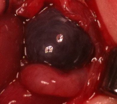Se halla una hernia inguinoescrotal incarcerada con asa de intestino delgado que muestra signos isquémico-hemorrágicos en pared (Figura 1), teste derecho de aspecto necrótico (Figura 2) e hidrocele reactivo. Tras 20 minutos de aplicación de calor local en el teste y la pared del asa, persiste mala perfusión, por lo que se decide orquiectomía derecha, resección de 4 cm del íleon terminal con anastomosis terminoterminal y apendicectomía profiláctica.