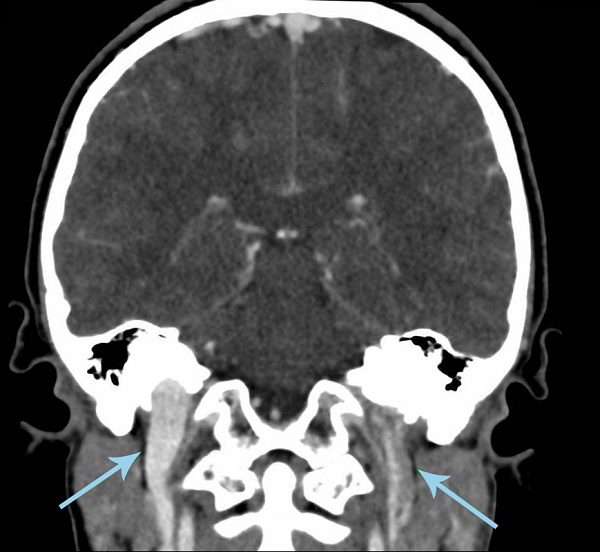 Se realiza TC craneocervical con contraste, objetivándose otomastoiditis complicada con trombosis de senos venosos cerebrales (seno sigmoide izquierdo, seno recto y ambos senos transversos), además de absceso en espacio cervical posterior izquierdo de aproximadamente 27 x 10 x 16 mm. Se informa de adecuada permeabilización de vena yugular interna izquierda.