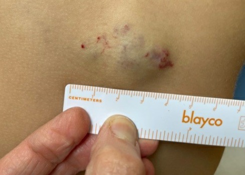 En la exploración física destaca una lesión de 40 x 25 mm, ligeramente abultada, con zona eritematosa en la superficie y vasos nutricios periféricos. Aparentemente dolorosa a la palpación.