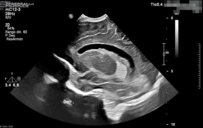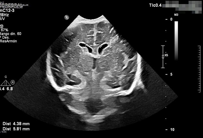 Ecografía transfontanelar. Hidrocefalia leve con prominencia e irregularidad de los plexos coroideos con posible ocupación de las astas occipitales de ventrículos laterales (de predominio derecho). Se sospecha la posibilidad diagnóstica de ventriculitis en paciente con diagnóstico de meningitis aguda.