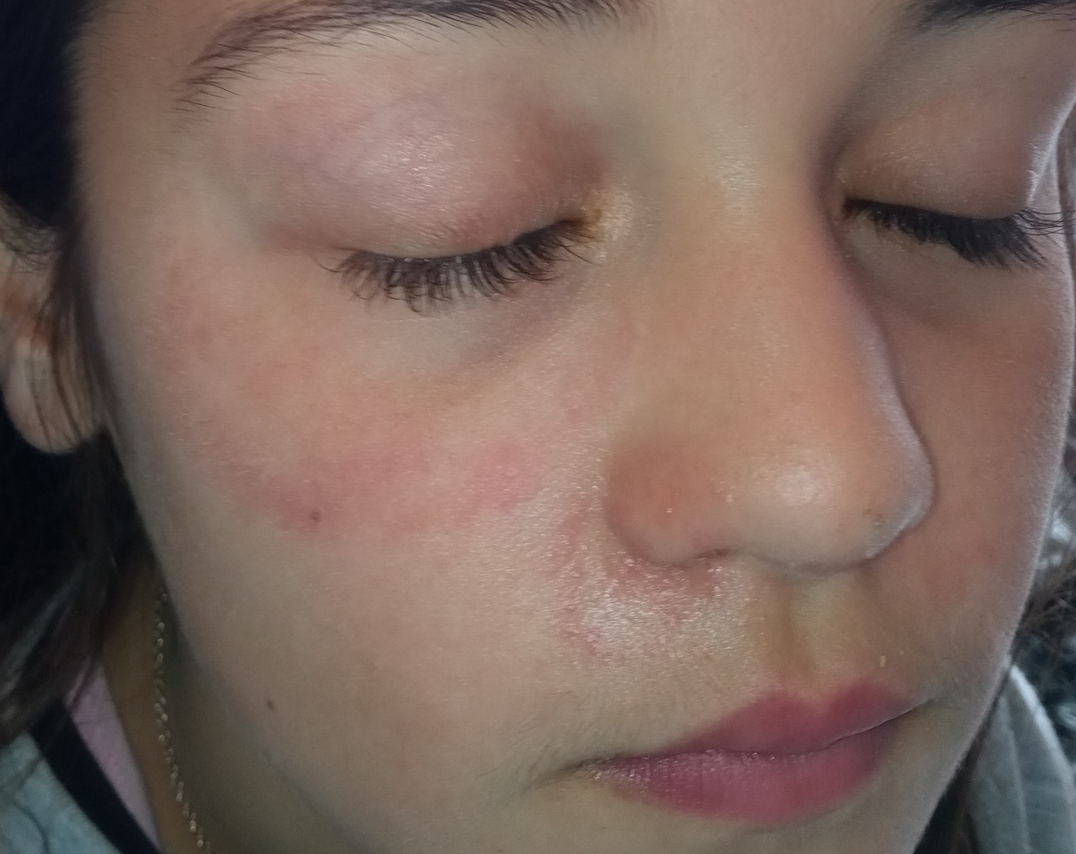 Paciente de 9 años que presenta placa eccematoeritematosa periocular con pápulas eritematosas en su interior desde hace dos meses (Figura 1). Inicialmente asociaba lesiones similares retroauriculares y en pliegues cubitales, que se resolvieron con corticoide tópico, persistiendo la lesión periocular. Se pautó inhibidor de la calcineurina sin mejoría. Antecedente de dermatitis atópica. Le gusta jugar a maquillarse. Tienen un perro sin lesiones aparentes. Resto de familiares sin lesiones.