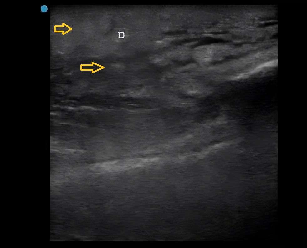 Figura 2. Ecografía musculoesquelética y de partes blandas de la región lateral del tercio distal del miembro inferior derecho. Se aprecia edema subcutáneo alrededor de los lobulillos (patrón “en empedrado” o cobblestoning) (flechas amarillas).