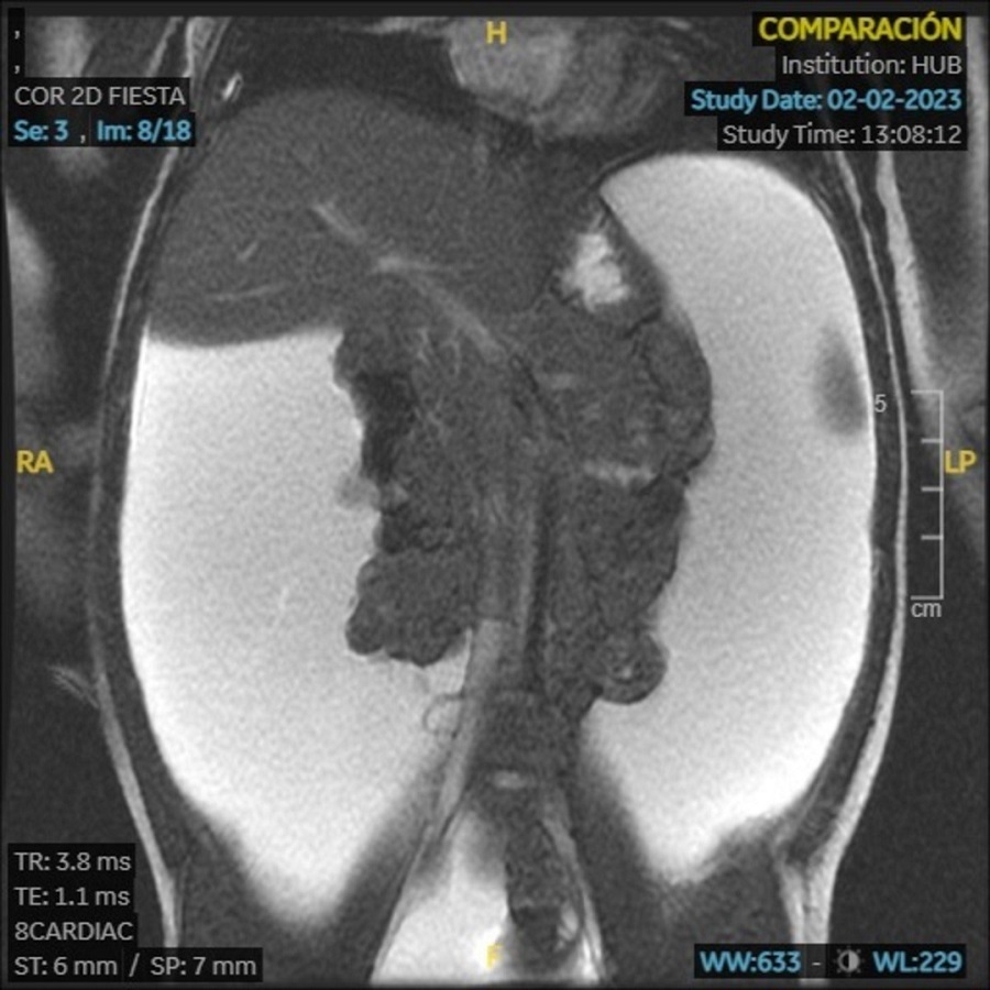 Figura 1. RM abdominal. Corte coronal. Lesión quística desde mesogastrio hasta pelvis (33 x 12 x 10 cm) que desplaza las asas del intestino delgado y presenta tabiques en el margen posterior derecho. Se muestra hiperintensa en T1.