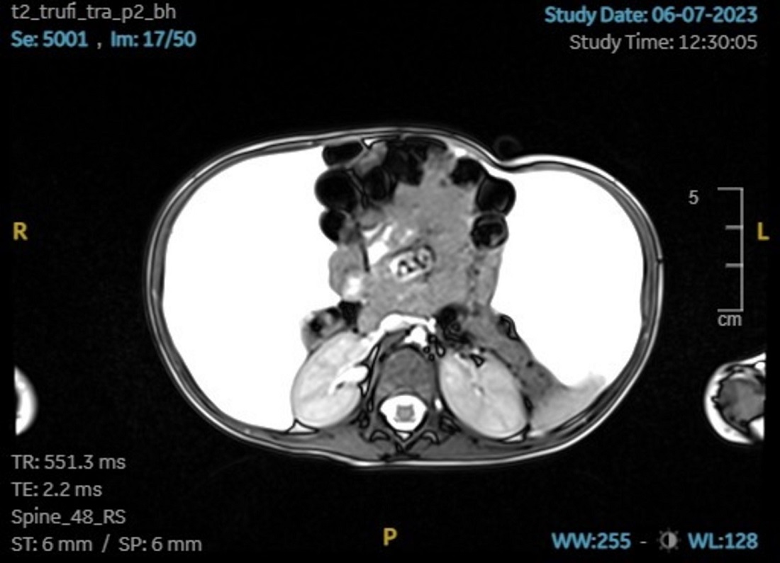 Figura 2. RM abdominal. Corte axial. Gran cantidad de líquido con desplazamiento central y anterior de todo el paquete intestinal, llegando a contactar las asas con la pared anterior abdominal. En la zona inferior presenta algún lóculo. No presenta aumento de intensidad de capas peritoneales tras la administración de contraste.