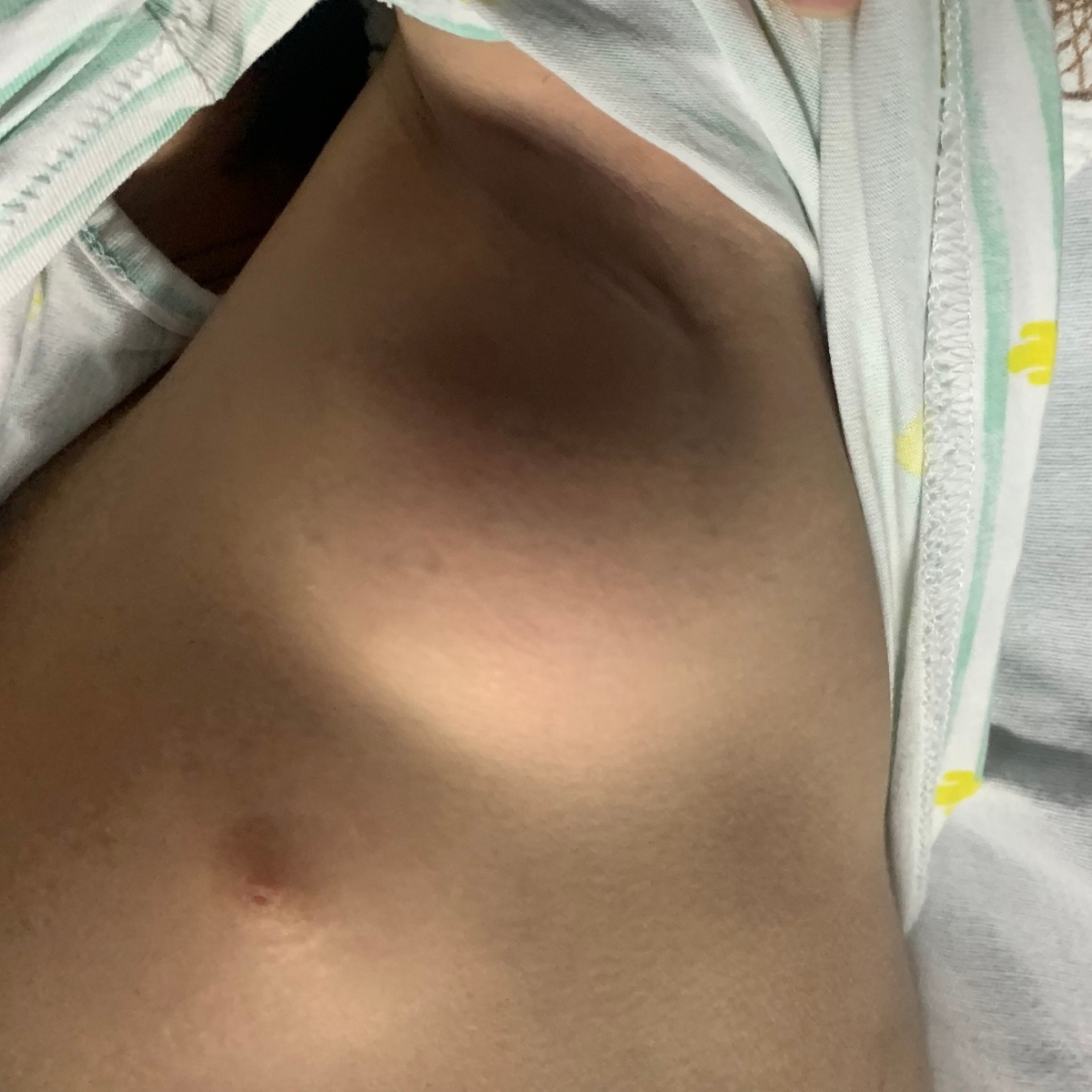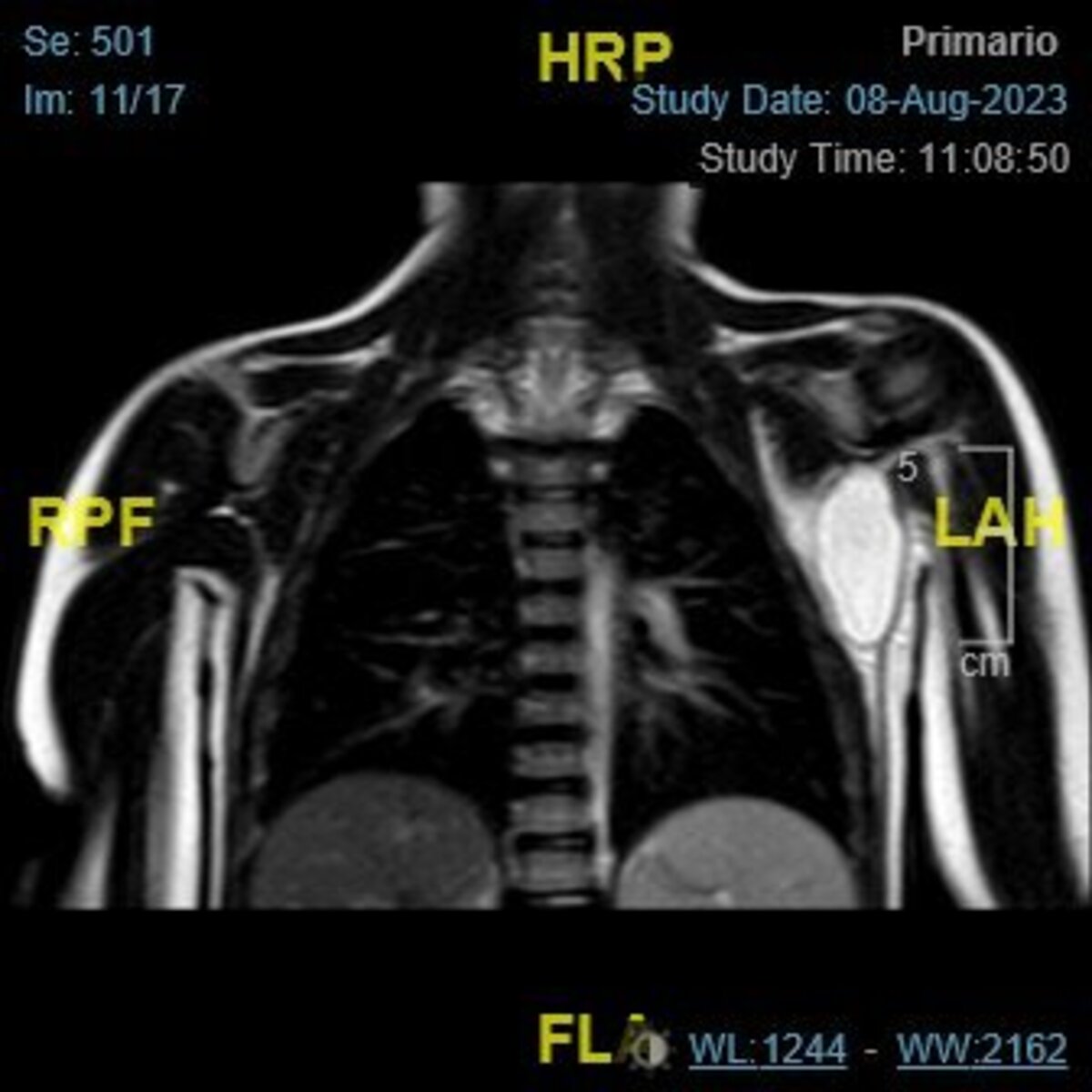 Niña de cuatro años que acude a Urgencias por presentar desde hace 30 horas una tumoración dolorosa en la región axilar izquierda (Figura 1). Asocia pico febril de 38,5 °C sin otra sintomatología. Sin antecedentes de interés. Se realiza analítica sanguínea, en la que destaca un leve aumento de reactantes de fase aguda, y una ecografía que muestra una colección heterogénea con septos en su interior. No se visualiza líquido articular. Se solicita resonancia magnética (Figura 2).