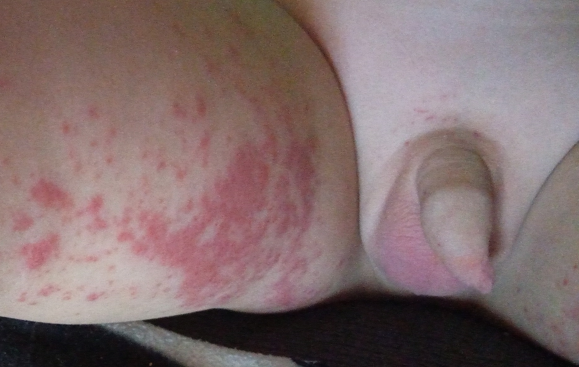 Figura 2. Lesiones purpúricas, palpables, en la zona proximal del muslo. Imagen del inicio de la presentación del cuadro con zona peneana sin alteraciones.