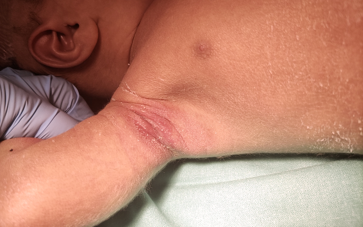 Neonato de 5 días, sin antecedentes de interés, con lesiones cutáneas eritematosas y exudativas en la región axilar bilateral, cara interna del brazo derecho y región inguinal. No presenta vesículas ni pápulas, pero sí descamación generalizada (Figura 1). Afebril. No irritabilidad. No rechazo del alimento. Los padres niegan el uso de productos cosméticos irritantes y desconocen el tiempo de evolución de las lesiones. Analítica anodina. Hemocultivo negativo. Flora saprófita en cultivo exudado cutáneo. Hongos negativos.