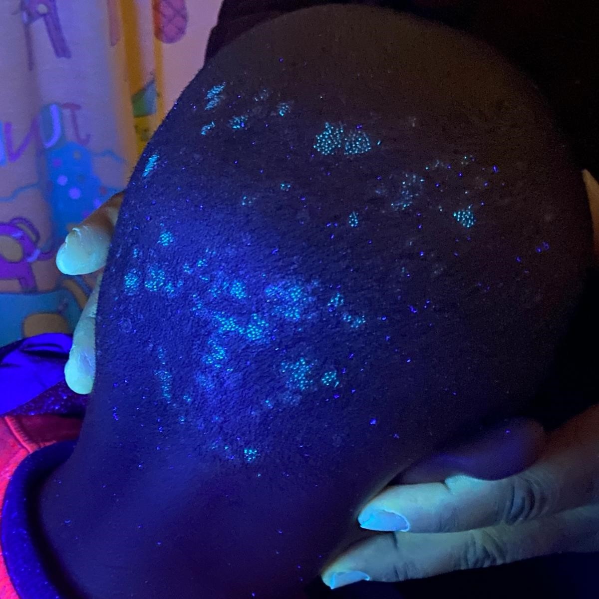 Fig. 2. Coloración azul verdosa de las lesiones del cuero cabelludo bajo el examen con luz de Wood.