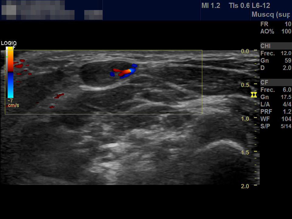 Niño de 7 años que acude a consulta de Atención Primaria por aparición de tumoración cervical de 2 días de evolución. A la exploración en la región lateral cervical posterior al esternocleidomastoideo se aprecia una tumoración móvil no adherida de consistencia blanda de aproximadamente 1 cm de diámetro sin cambios superficiales acompañantes. No presenta otra clínica sistémica asociada. Antecedentes personales y familiares sin interés. No habían observado similar lesión en otras ocasiones. Realizamos ecografía simple (Figura 1) y ecografía Doppler de la lesión (Figura 2).