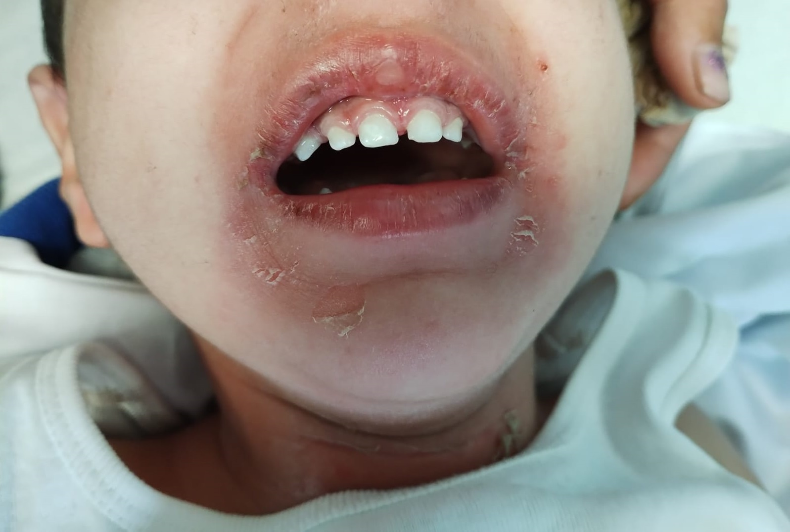 Figura 1. Lesiones descamativas periorales. Ampolla flácida en el labio superior.